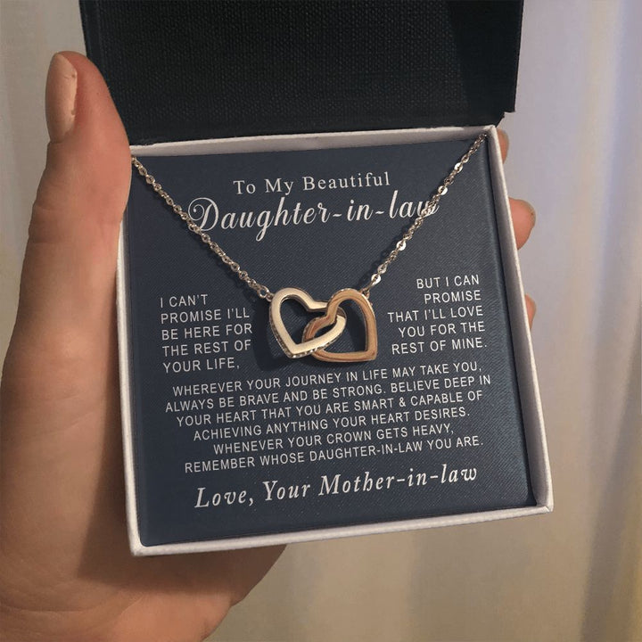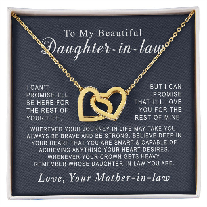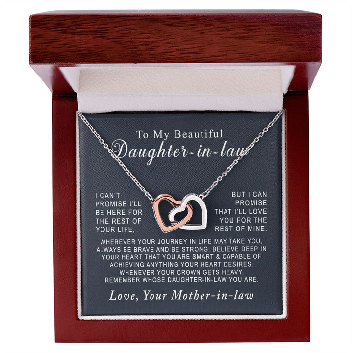 The necklace is presented on the message card, which reads:'To My Beautiful Daughter-in-law, I can't promise I'll be here for the rest of your life. But I can promise that I'll love you for the rest of mine. Wherever your journey in life may take you, always be brave and be strong. Believe deep in your heart that you are smart & capable of achieving anything your heart desires. Whenever your crown gets heavy, remember whose Daughter-in-law you are. Love, Your Mother-in-law.'