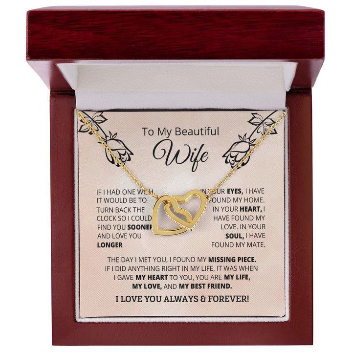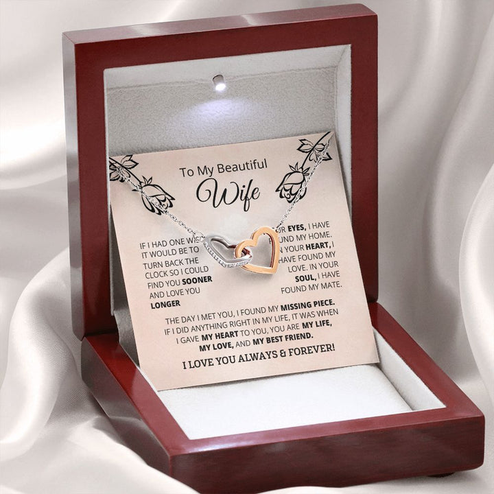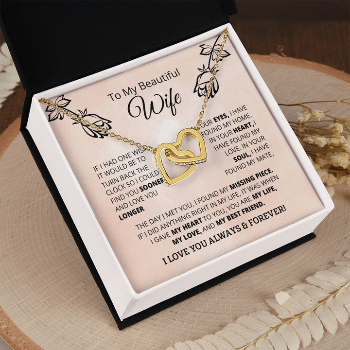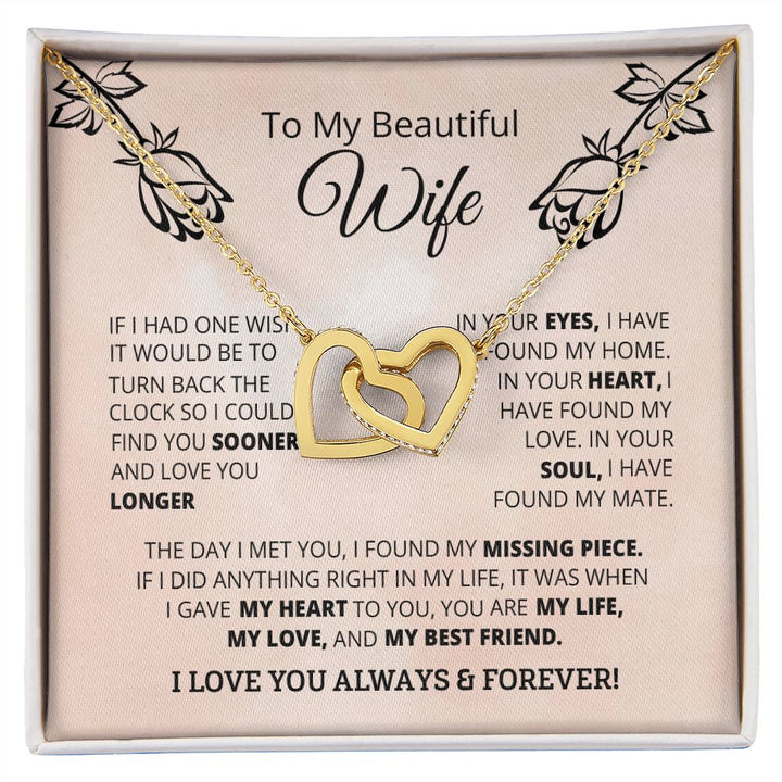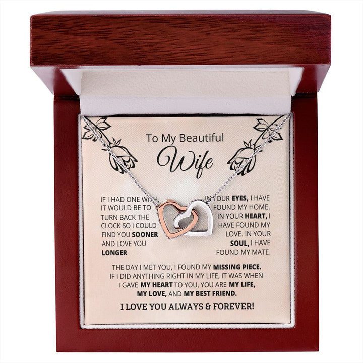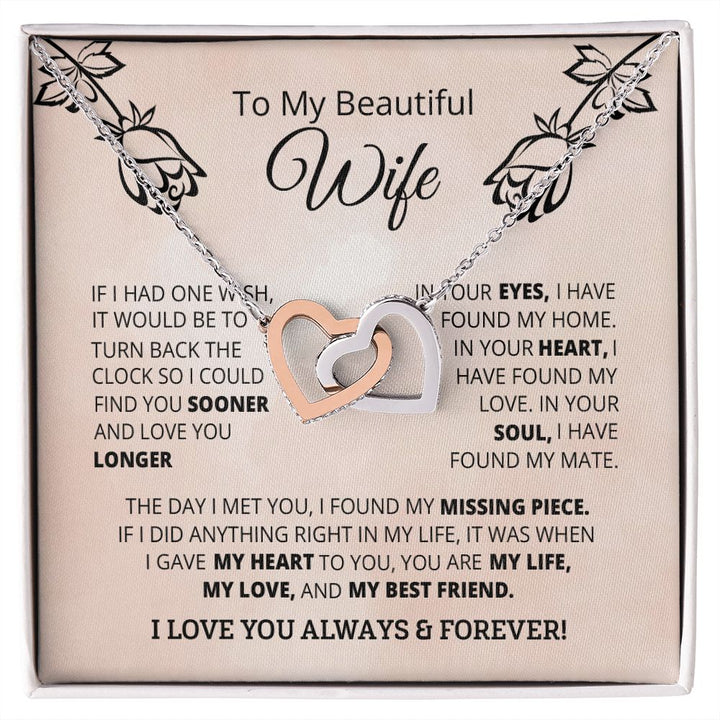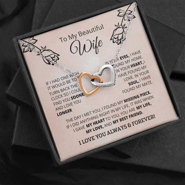The necklace is presented on the message card, which reads:'To My Beautiful Wife, If I had one wish, it would be to turn back the clock so I could find you sooner and love you longer. In your eyes, I have found my home. In my heart, I have found my love. In your soul, I have found my mate. I Love You Always & Forever!.'